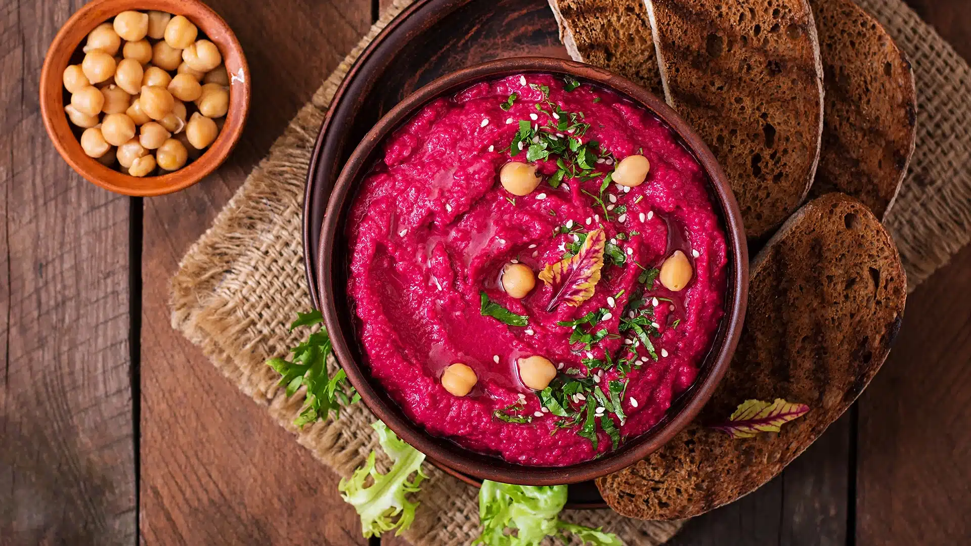 Haşlanmış nohutu, haşlanmış pancarı, tahini, sarımsağı, limon suyunu, tuz ve kimyonu rondoya alın ve pürüzsüz, kremamsı bir kıvam elde edene kadar çekin. Kıvamı çok yoğun gelirse az miktarda su ya da zeytinyağı ekleyerek dilediğiniz yoğunluğa getirebilirsiniz. Hazırladığınız karışımı servis tabağına alıp kaşığın tersiyle ortasını hafifçe çukurlaştırın. Üzerine zeytinyağı gezdirin ve son olarak birkaç damla balzamik sirke ve biraz maydanoz ile hem lezzet hem de görünüm açısından zenginleştirin. Çıtır ekmek dilimleri, lavaş cipsleri veya krakerlerle servis ederek yılbaşı sofranızda dikkat çeken bir pembe meze yaratabilirsiniz.
