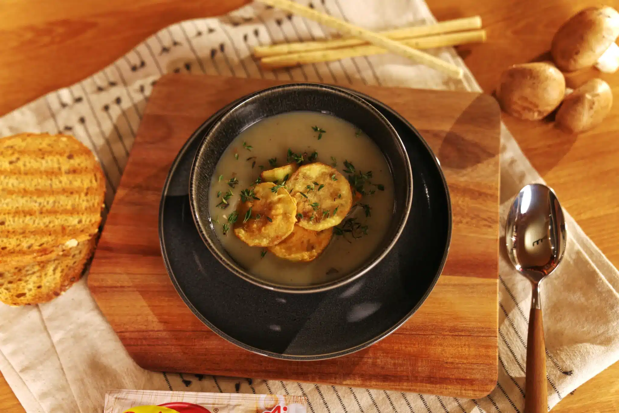 Çorbayı servis ederken üzerine patlıcan cipslerini ekleyin. Afiyet olsun.